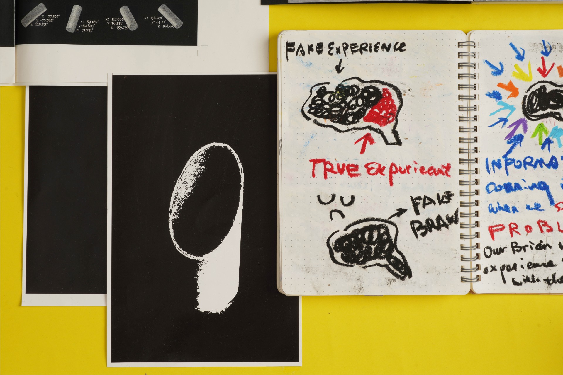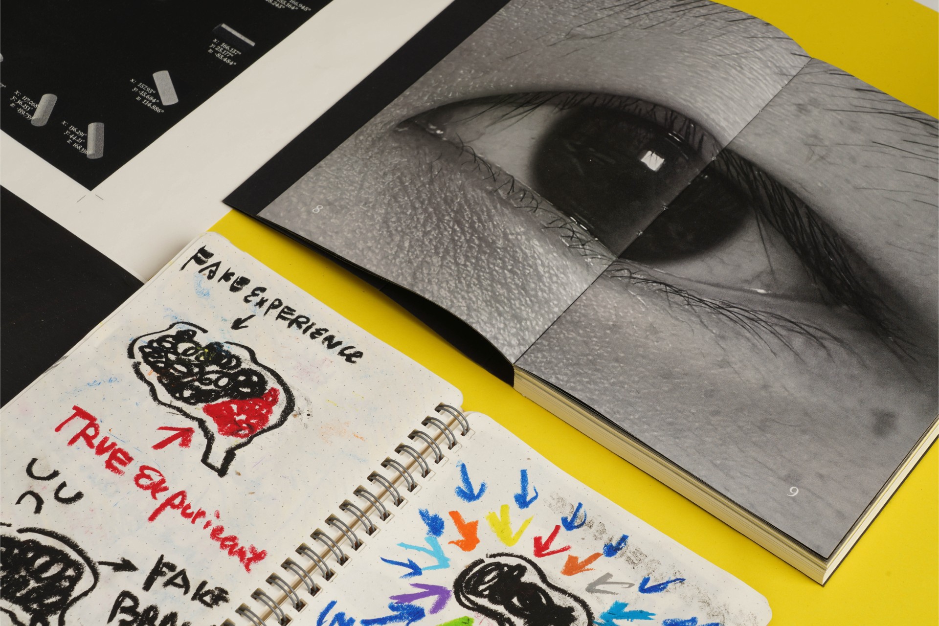 The left side frames the concept through photography, ready-made objects, and manuscripts, visualizing how homogenized cognition shapes perception. The right unfolds via exposure, reflection, and research—from the “0–9” experiment to “Cognitive Slicing” and interdisciplinary theory—forming a tabletop editorial system of layered analysis.